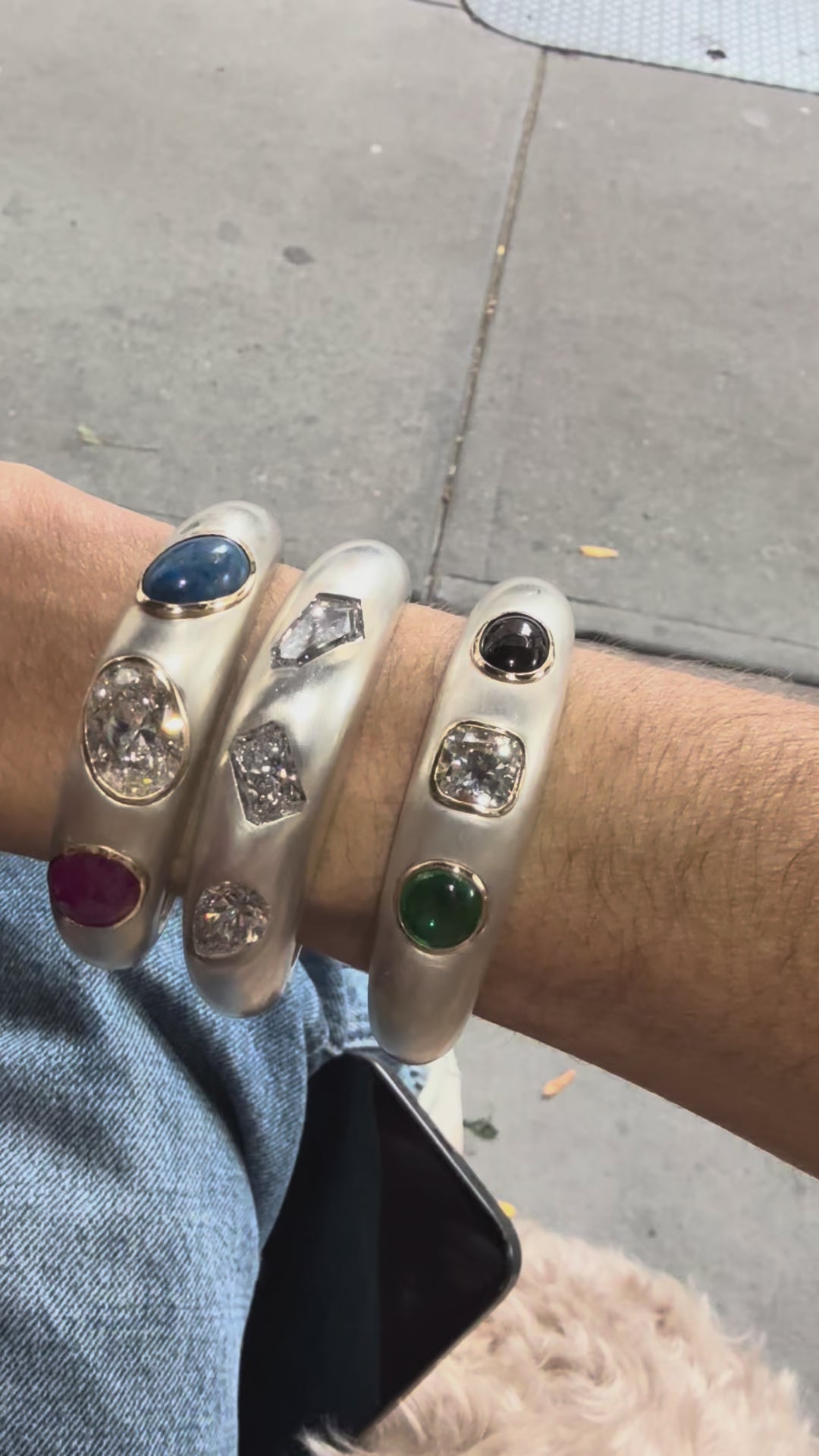 The "Romani" Cuff in Collaboration with LMC Fine Jewelry: Silver Cuff with 3 diamonds: a 3 carat pear, 3 carat radiant, and 3 carat shield. Middle cuff in the stack. Sized like Cartier cuffs.